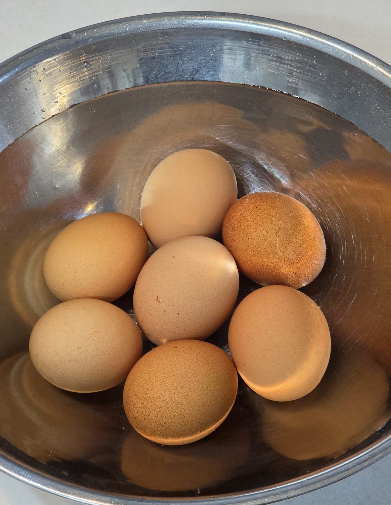 먼저 냉장고의 달걀을 꺼내서 상온에 서너 시간 방치합니다. 냉장고에서 바로 꺼낸 달걀은 삶았을 때 껍질이 잘 까지지 않는다고 하지요.