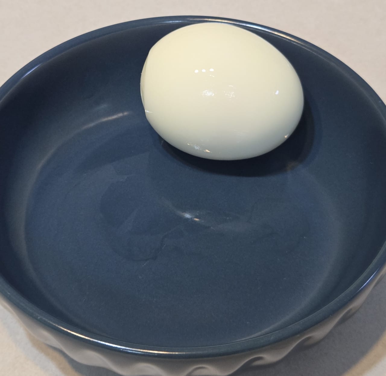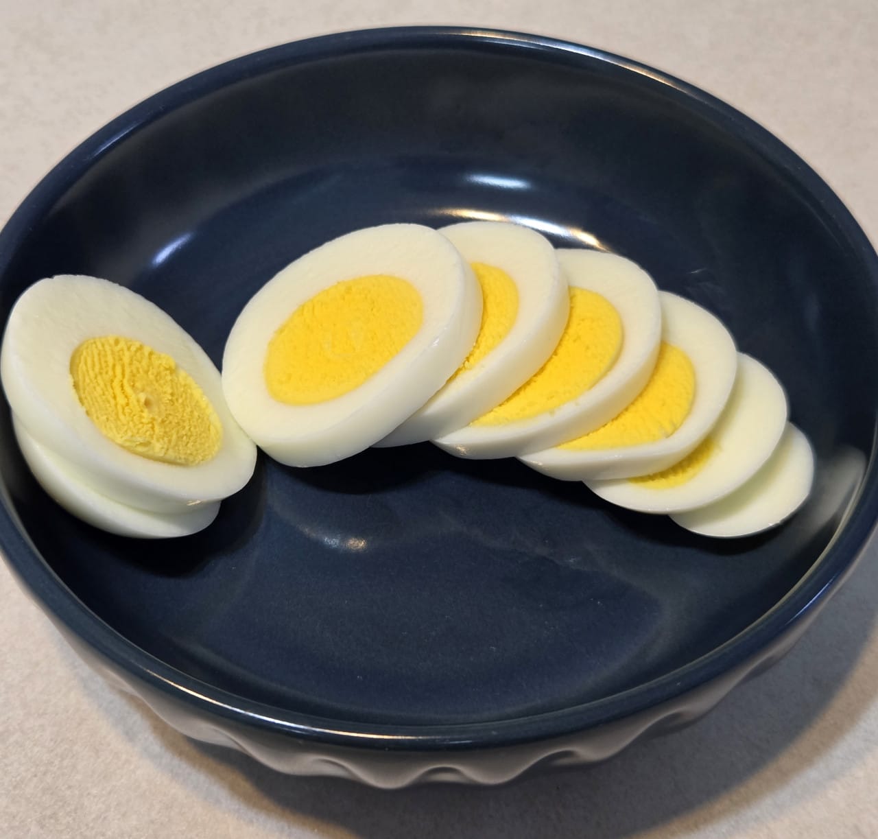 오래 익히면 생기는 노른자 주변의 검은 변색(검변, 녹흑변) 없이 딱 알맞게 익은 모습입니다. 달걀을 그냥 까먹는 것도 좋지만 사진처럼 에그 슬라이서로 잘라서 위에 맛소금을 솔솔솔 뿌려서 먹으면 더 맛이 좋습니다.