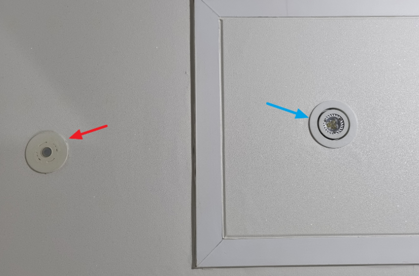 고개를 들어 천장을 살펴봤습니다. 파란 화살표가 가리키는 것은 전등이 확실하고 빨간 화살표가 가리키는 것은 움직임을 감지하는 센서로 보입니다. 빨간 화살표 쪽이 현관 쪽이기 때문에 움직임 감지 센서의 위치가 맞을 것이라고 생각했습니다.