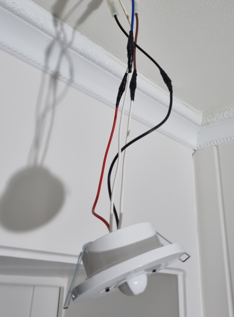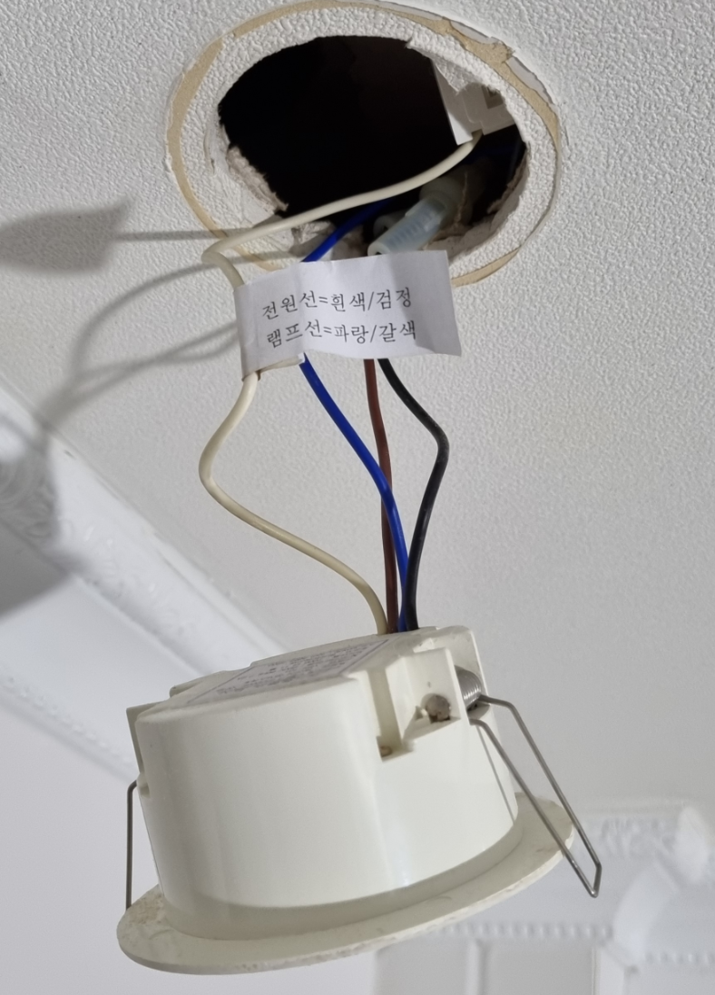 비전문가다운 솜씨로 새로운 센서를 연결했습니다. 전기선의 색이 서로 달랐지만 설명서를 보면서 하나씩 잘 연결해 줬습니다. 나름 깔끔하게 해보려고 했는데 이렇게 됐습니다. 천장에 넣어버리면 보이지 않을테니 단단하게만 테이프를 감아줬습니다.
