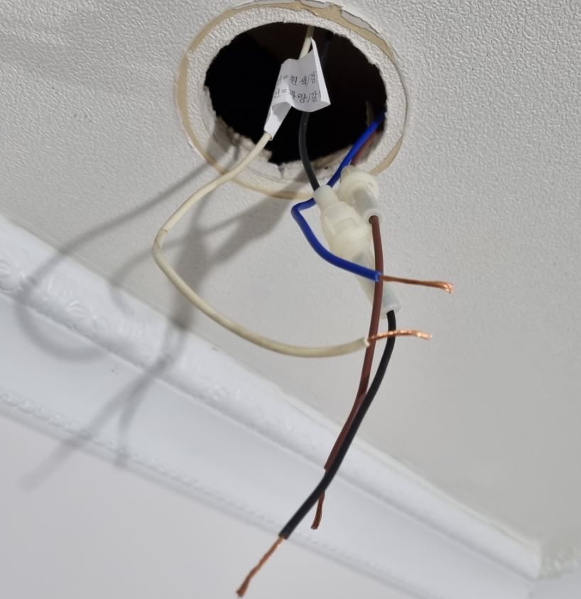 선을 천장으로 밀어 넣고 양쪽 클립을 벌려 위로 모아서 밀어 넣어 줬습니다. 겉 보기에는 완벽하게 잘 된 것 같네요.