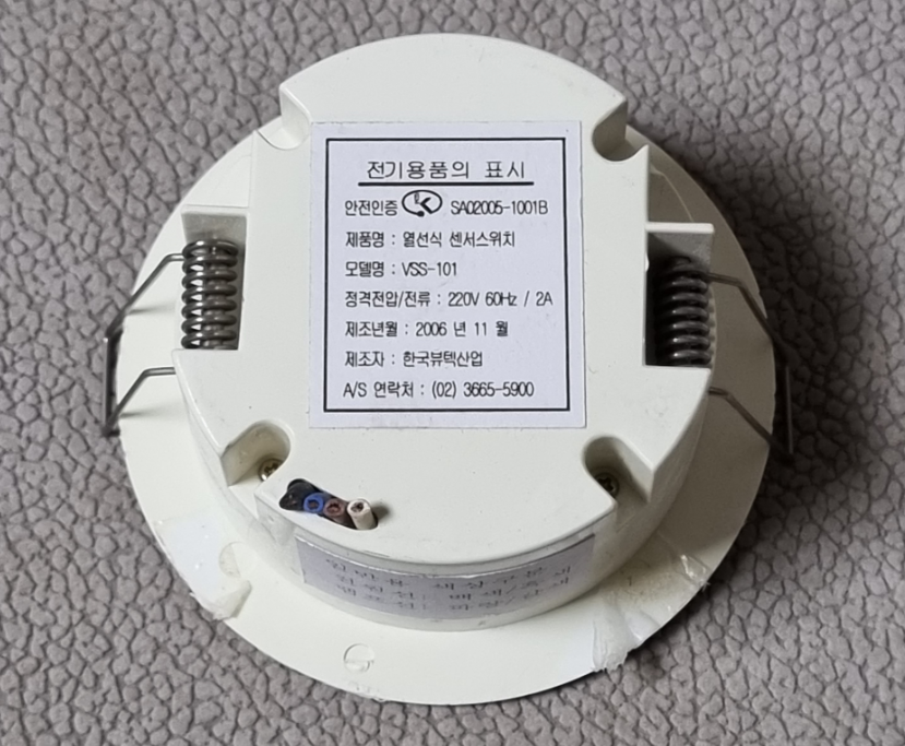 떼어 낸 센서입니다. 2006년 제조품으로 아마 아파트가 지어질 때 설치된 것 같습니다. 15년이 넘게 한 번도 고장이 나지 않았나 봅니다.