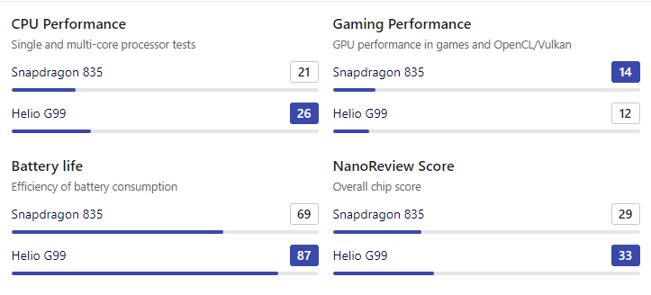 스냅드래곤 835는 삼성 갤럭시 S8 시리즈에 들어갔던 프로세서인데 Helio G99는 그와 비슷한 수준을 보여주는 미디어텍의 프로세서입니다. 여러 후기들에서 FHD (1920x1080) 환경에서 괜찮은 성능을 보여주는 프로세서라는 평을 합니다. 가성비가 좋기 때문에 많은 제품에 채용되었다고 하네요.
