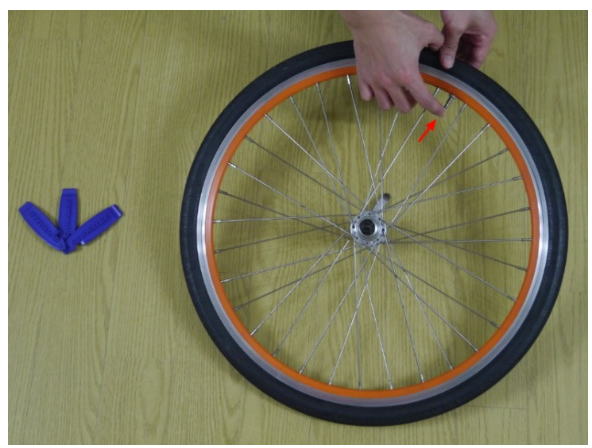 다음으로 걸어줄 수 있는 스포크를 찾아(보통 3개를 건너 뛴 간격) 두 번째 타이어 주걱을 걸어 줍니다.