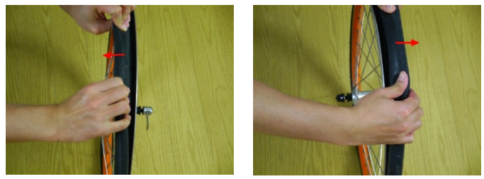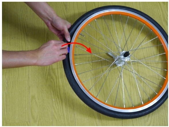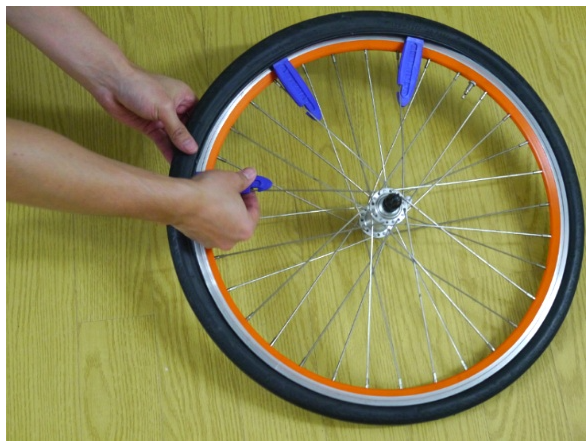 위에서 타이어 주걱 사용법을 설명한 대로 타이어 주걱을 밀어 넣어 와이어를 걸어서 바퀴 중심 쪽으로 젖혀 줍니다.