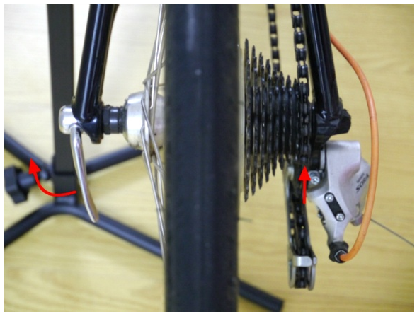 그 다음 뒷 드레일러를 가장 작은 기어에 위치하도록 조정해줍니다. 그림 오른쪽 화살표처럼 말이죠.