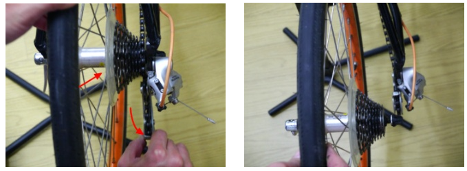 만약 레버를 풀었을 때 바로 바퀴가 빠지지 않으면 왼쪽 그림처럼 오른손으로 뒷 드레일러를 눌러주고 왼손으로 바퀴를 살짝 눌러 주면 오른쪽 그림과 같이 뒷 바퀴를 분리해 낼 수 있습니다.