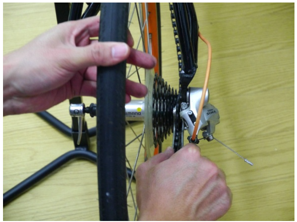 그 다음 가장 체인을 가장 작은 기어에 걸어주고 바퀴를 위로 당겨 줍니다.