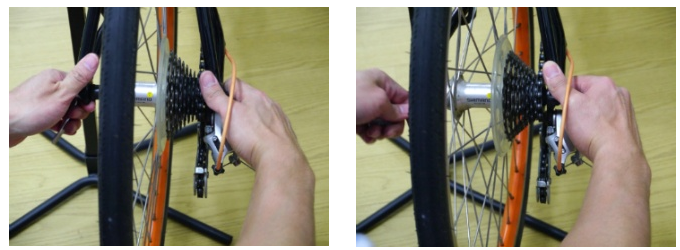 먼저 오른손으로 뒷 드레일러를 살짝 눌러 주고 왼손으로 바퀴를 위치 시킵니다.