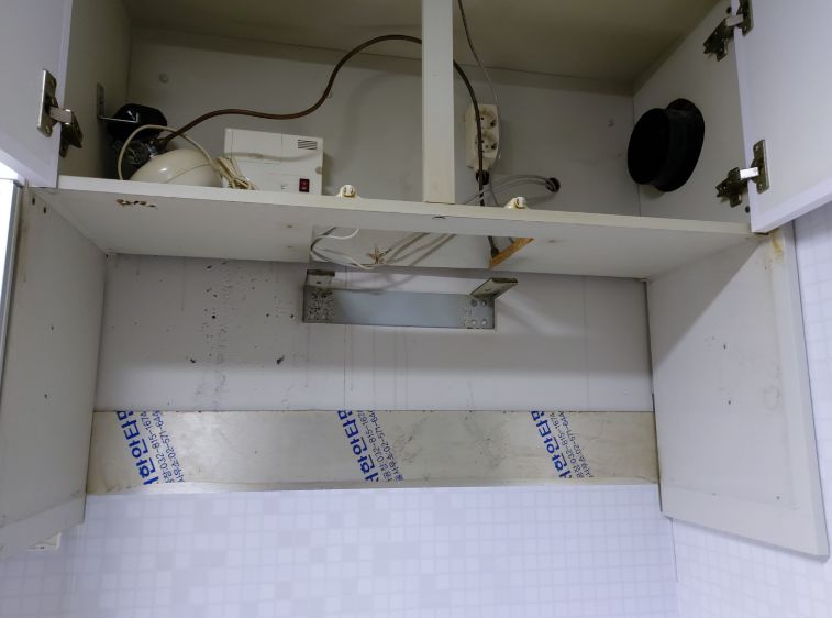 그런데 사용할 수 없는 물건입니다. 문을 들어올리면 팬이 동작하면서 소리는 나는데 레인지 쪽으로 가루같은 것이 떨어지고 끈적한 액체도 떨어졌기 때문인데요. 이전에 살던 사람들은 어떻게 사용했는지 모르겠습니다.