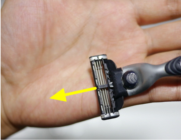 면도날 정리를 위해 그림과 같이 새끼 손가락이 이어지는 손바닥 쪽을 이용하기로 했는데요. 손바닥 중에 이 부분이 살이 많아서 면도날과 밀착이 잘 되어 잘 씻어 줄 것이라고 판단했습니다.