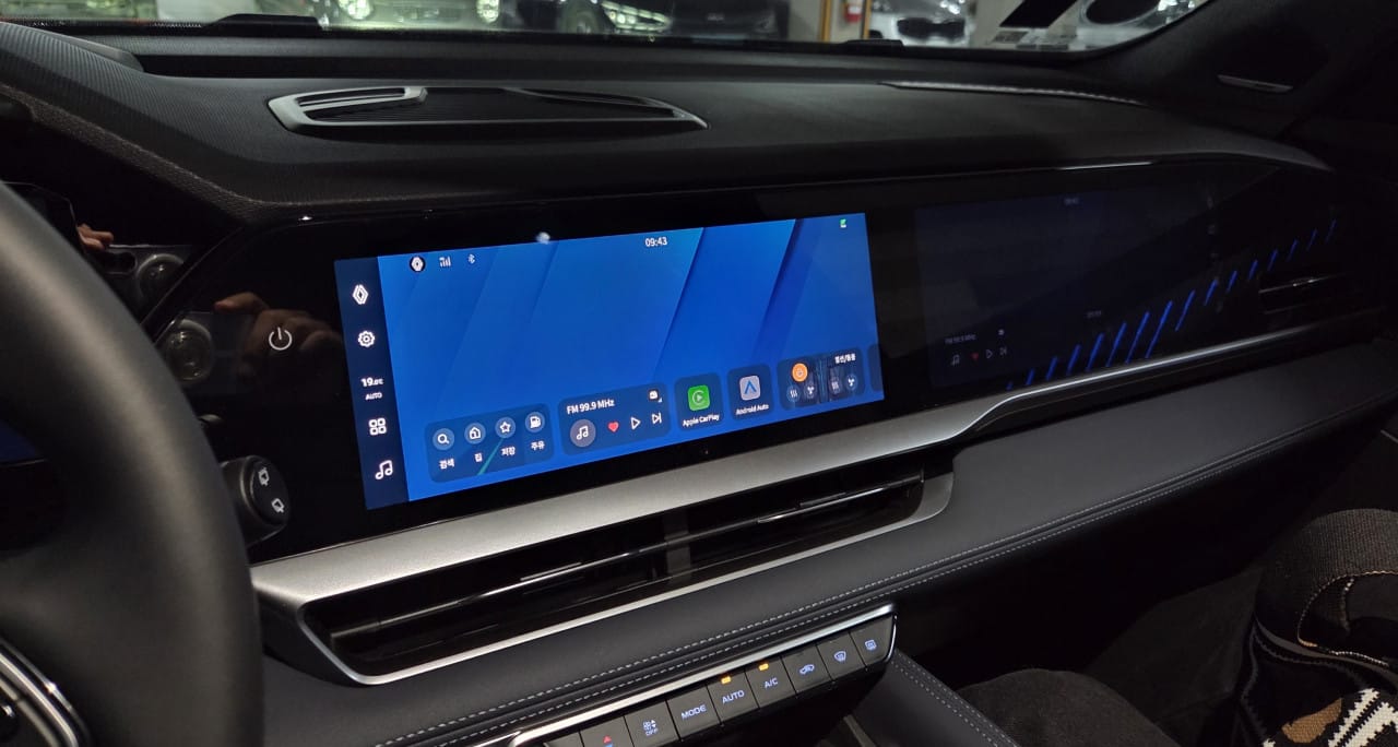 눈에 가장 띄는 파노라마 스크린입니다. 화면이 커서 활용하기 좋고 안전 때문인지 운전석에서는 보조석 쪽의 화면이 안 보입니다. 어두운 환경일 때는 사진처럼 희미하게 보이긴 합니다.