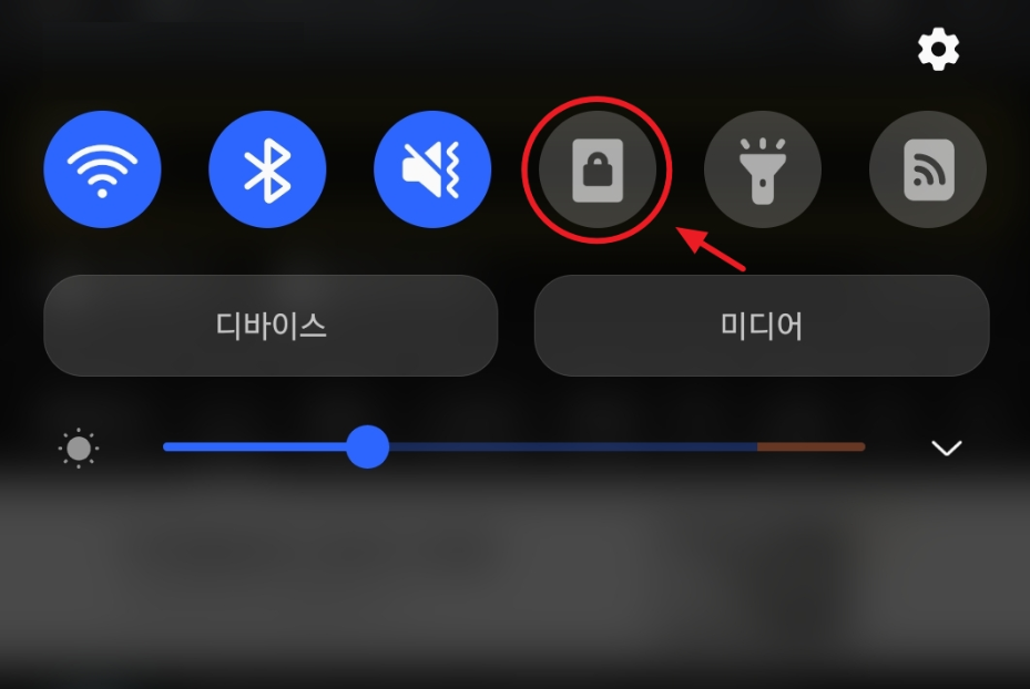 화면을 쓸어 내리면 나오는 메뉴들 중에 '세로 고정/자동 회전'을 설정하는 아이콘이 있습니다.