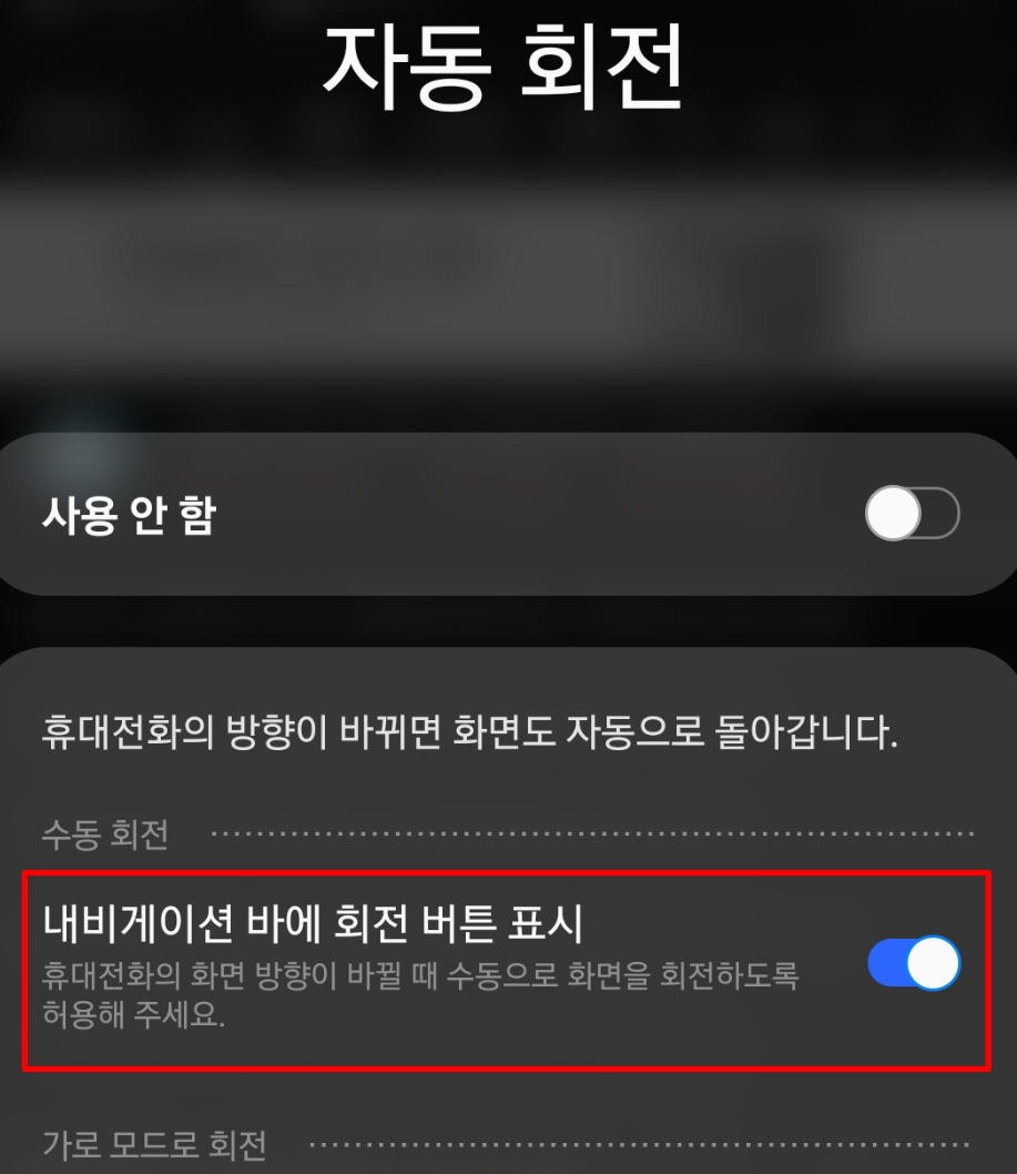 '휴대전화의 화면 방향이 바뀔 때 수동으로 화면을 회전하도록 허용해 주세요.'라는 설명이 있습니다..
