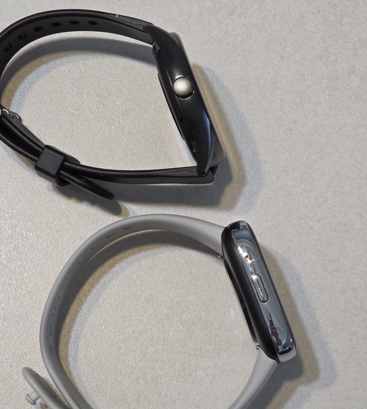 사용하던 레드미 워치3 액티브와 두께는 비슷합니다. 레드미 워치3 액티브는 고정형 밴드이고 QCY GT PRO는 22mm 스트랩을 사용해서 쉽게 교체가 가능한 형태입니다.