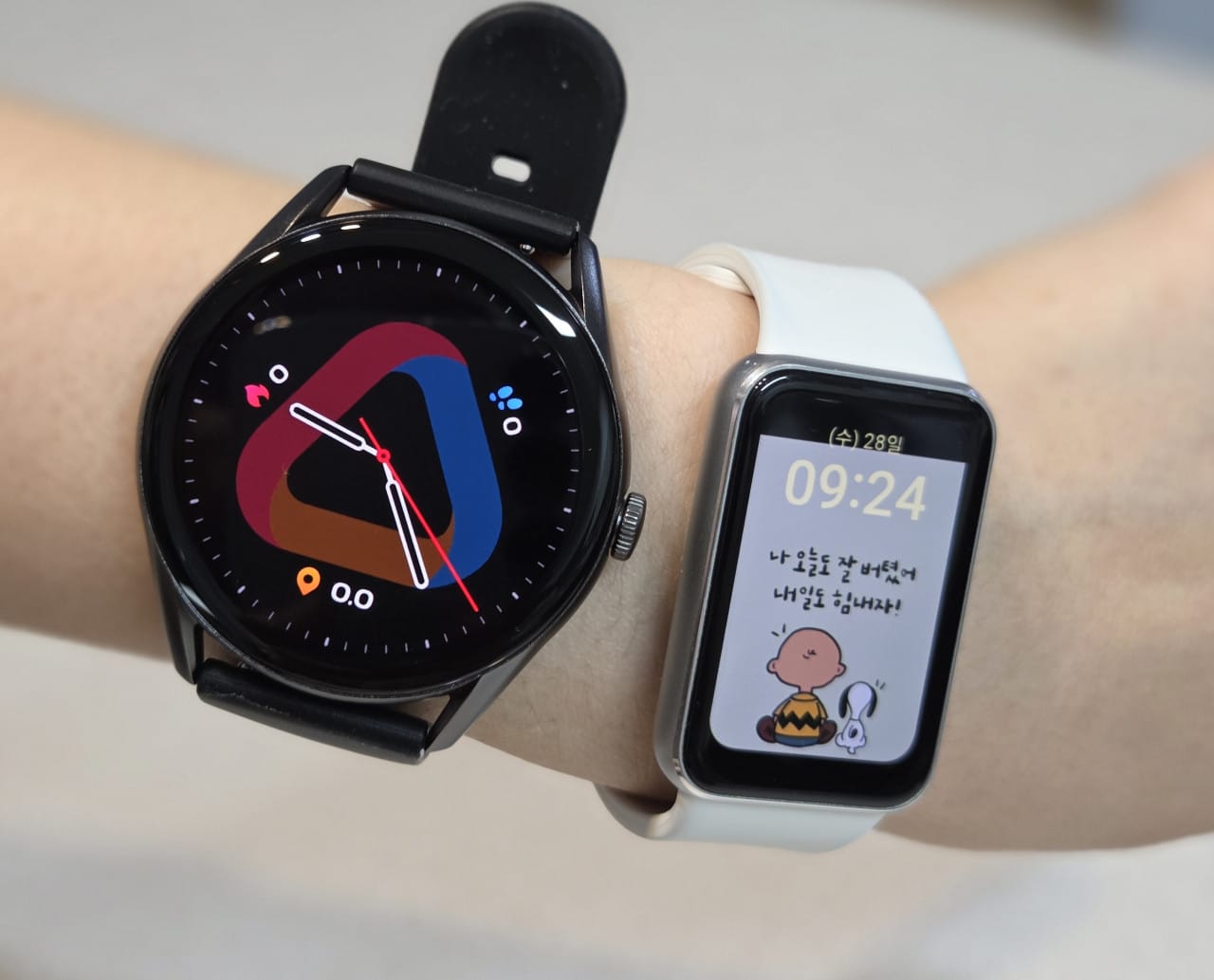 아내가 사용하는 갤럭시 핏3과 크기를 비교해 봅니다. 원형 화면이지만 정보를 표시하기에는 부족하지 않을 것 같네요.