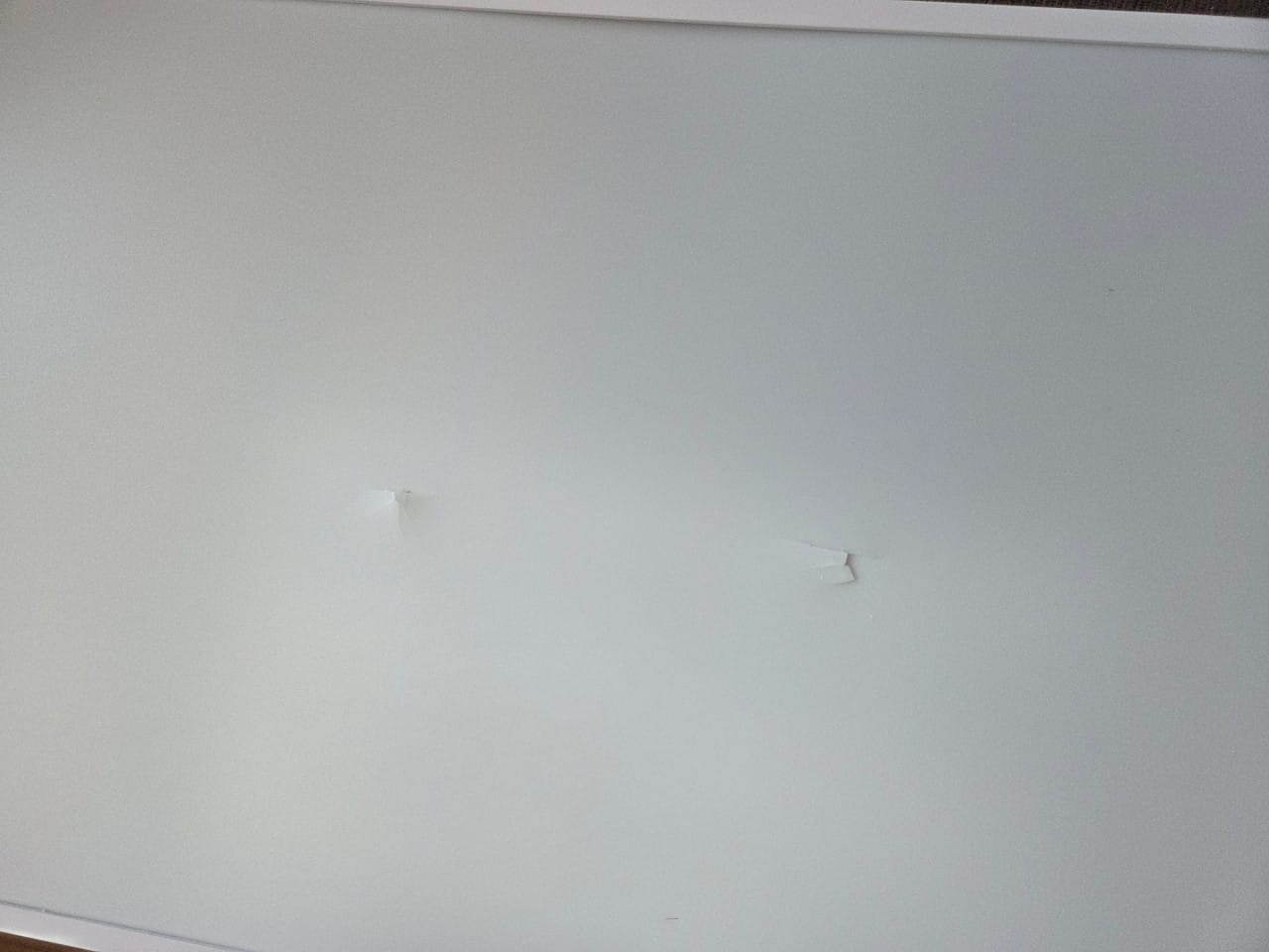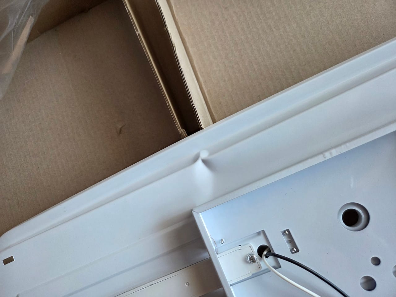 이 크고 얇은 제품을 배송하는데 보호 포장 없이 허술하게 제품 박스 상태로 달랑 왔다는 게 걸리긴 했는데 뜯어보니 역시나 이렇게 제품이 손상되어 있었습니다. 사진으로 찍은 부분 외에도 서너 곳이 더 찌그러져 있었습니다.