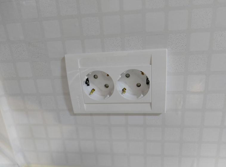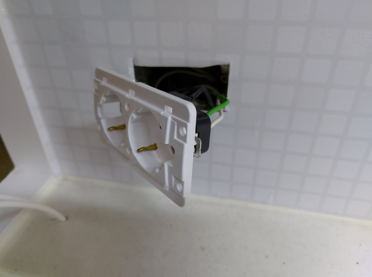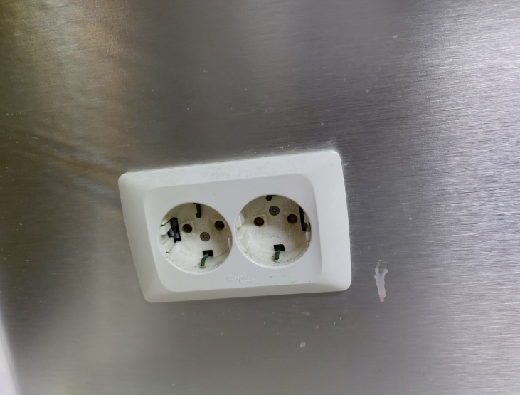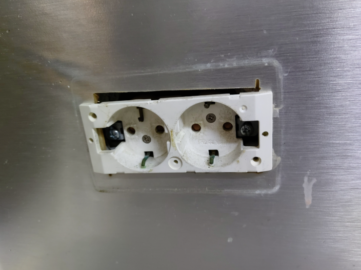 가까이에서 보니 콘센트 자체도 너무 더럽고 상태가 좋지 않습니다. 왼쪽 콘센트를 보면 접지 선이 구부러져서 플러그를 꽂지 못하게 되어 있습니다. 시트지 작업이 아니더라도 교체 했어야 할 부분입니다.